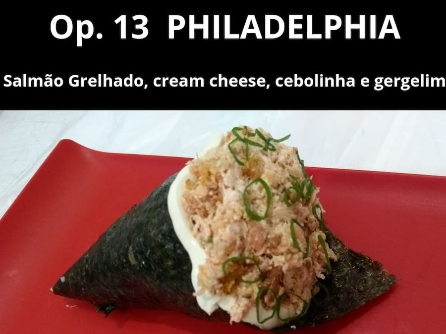 Cone Enrolado na Alga: Salmão Grelhado Cream Cheese , Cebolinha e Gergelim, Arroz Oriental Premium Acompanha 1 Sache Shoyu