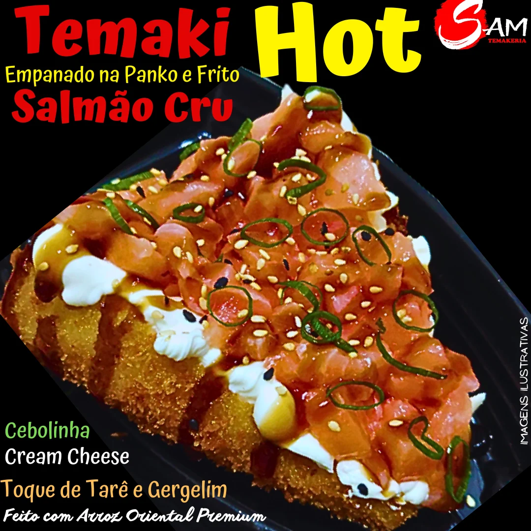 2 Temaki Hot (empanado na Panko e Frito) feitos c/ salmão grelhado , Arroz Oriental Premium , Cream Cheese , Cebolinha , Toque Tarê + 10 Peças Uramaki Salmão Grelhado + 20 Peças Hot Roll Salmão Acompanha 3 Saches Tarê + 3 Sache Shoyu + 2 Hashis