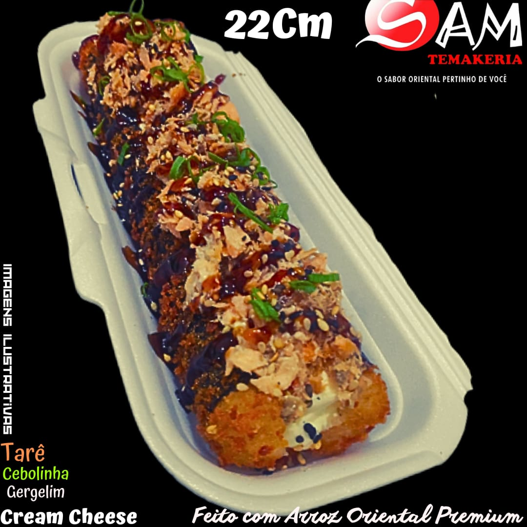 Sushi em formato HotDog tam aprox 22 cm Empanado e frito, SALMÃO GRELHADO, Cream Cheese, Arroz Oriental Premium , Cebolinha , Gergelim e Toque de Tarê Acompanha 1 Sache Sache Tarê