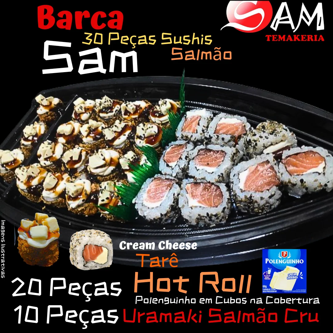 6 unid Niguiri Salmão Cru + 10 peças Hot Roll Salmão + 10 peças Hot Roll c/ Salmão Grelhado Extra na Cobertura Cream Cheese , Cebolinha Toque de Gergelim e Tarê > sushis Feitos com Arroz oriental Premium !!! Acompanha 1 Sache Shoyu + 1 Saches Tarê + 2 Hashis + Wassabi