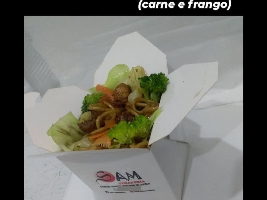 Macarrão Oriental Proteínas : Carne e Frango ; Legumes Selecionados : Brócolis, Repolho e Cenoura ao Toque Especial com Molho Shoyu e Óleo de Gergelim Serve 1 Pessoa - é uma Delícia !!! Acompanha 1 Sache Shoyu + 1 Hashi Peso total 400 gr