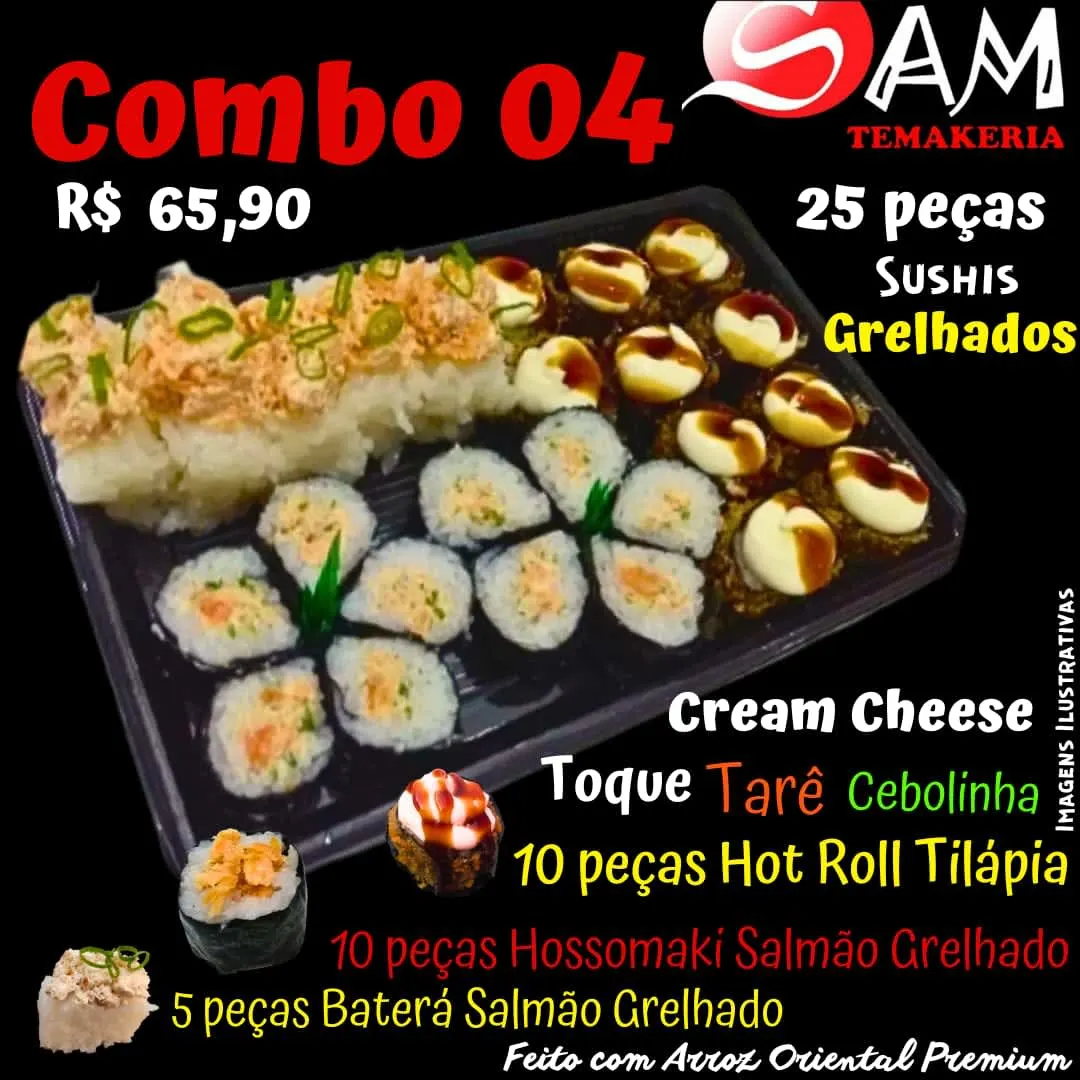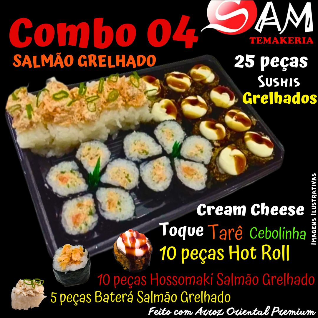 4 unid Batera cobertura Salmão Grelhado + 4 unid Hot Roll Salmão + 4 unid Uramaki Salmão Grelhado + 5 unid Hossomaki Salmão Grelhado c/Cream Cheese Acompanha 2 saches shoyu + 1 sache tare + 1 Hashi