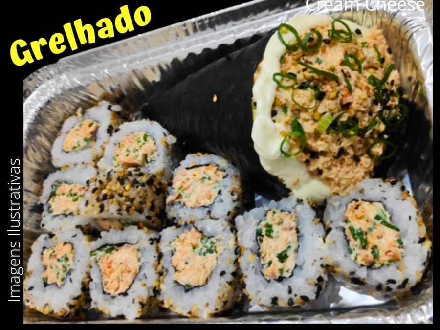 10 unid Hot Roll Tilapia + 10 unid Hossomaki Salmão Grelhado c/ Cream Cheese e Cebolinha + 5 unid Bater cobertura Salmão Grelhado total 25 Peças Sushi Grelhados !!! Acompanha 2 saches shoyu + 1 sache Tarê + 1 Hashi