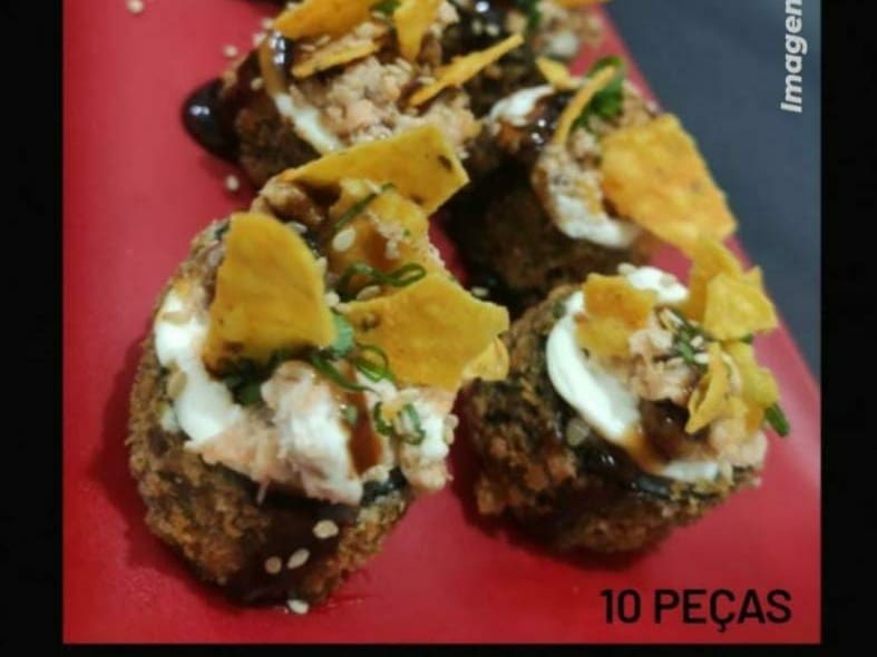 10 Peças Sushi empanado na Panko e Frito, Recheio: Salmão, Arroz Oriental, Cobertura Salmão Grelhado ,Cream Cheese, Doritos, toque de molho Tarê, cebolinha e Gergelim Acompanha 1 Sache Tarê + 1 Hashi