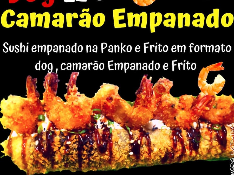 Sushi em formato Hot Dog tam aprox 22CM Empanado na Panko e Frito, Camarões Selecionados Empanados na Panko e Fritos Arroz Oriental, Cream Cheese , Toque Tarê, Cebolinha e Gergelim Acompanha 1 Sache Tarê