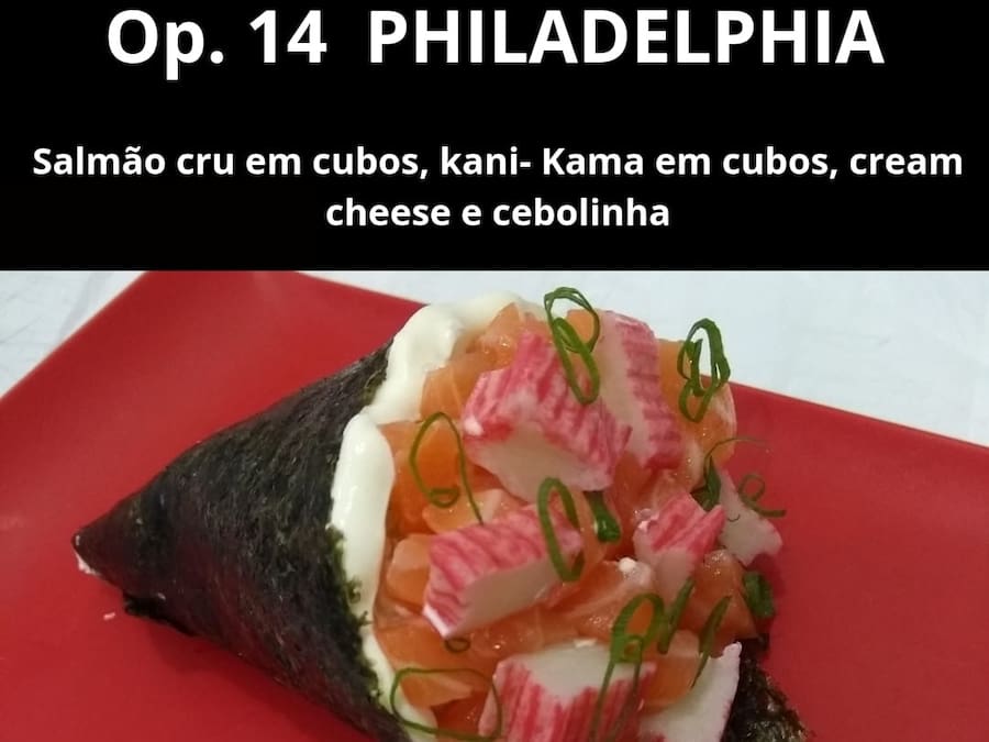 Cone Enrolado na Alga: Kani-Kama em Cubos e Salmão Cru em Cubos Cream Cheese , Cebolinha , Arroz Oriental Premium Acompanha 1 Sache Shoyu