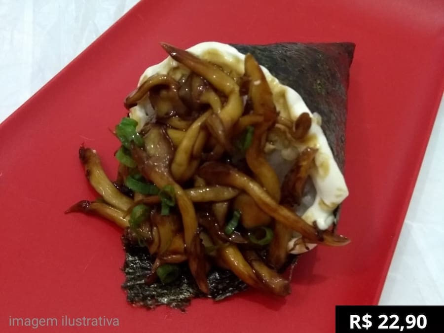 Cone Enrolado na Alga: Cogumelos Shimeji Brancos Marinados na Manteiga Cream Cheese , Cebolinha, Tarê , Arroz Oriental Premium Acompanha 1 Sache Tarê