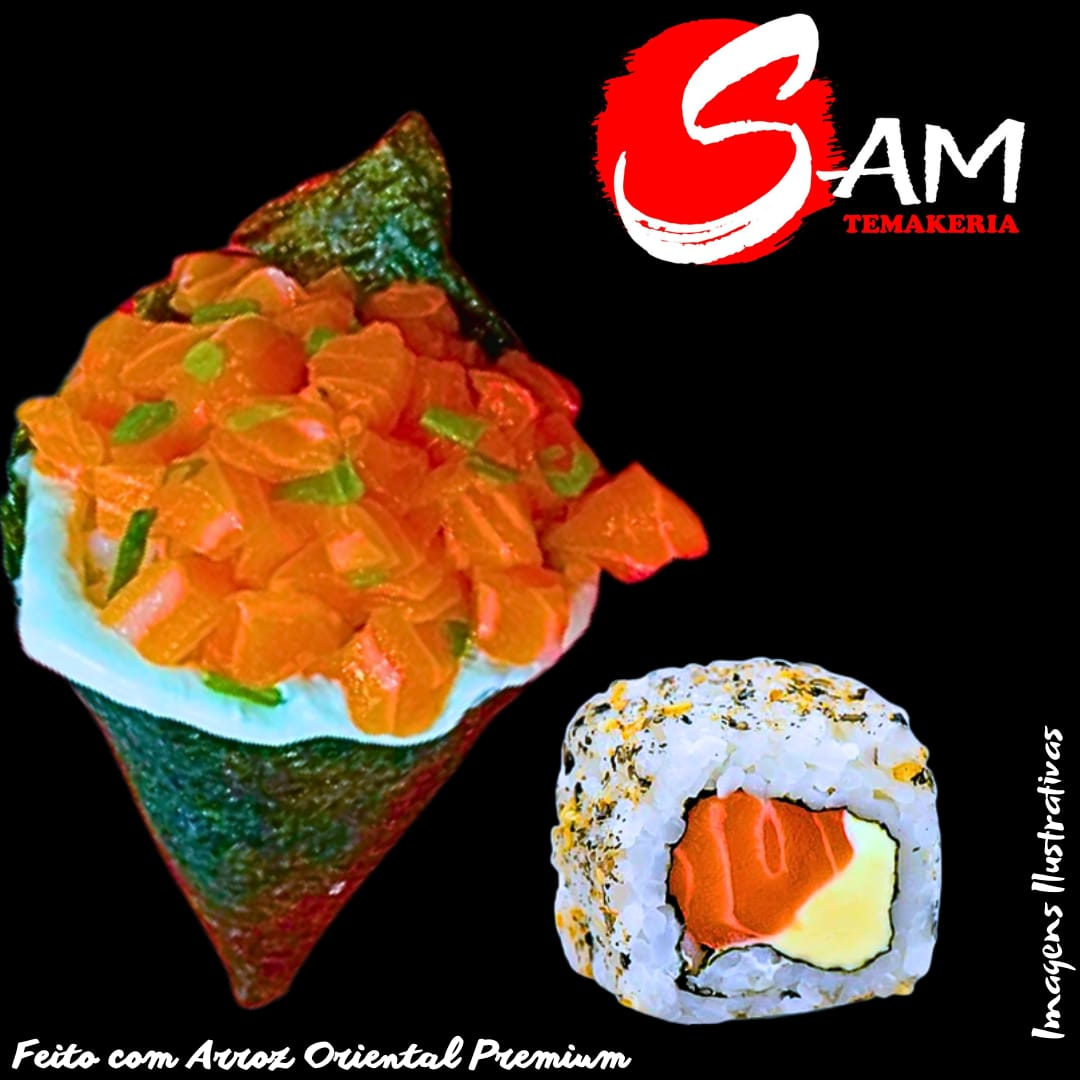 1 unid Temaki de Salmão Cru ou Grelhado Simples Completo + 4 Peças Hot Roll Salmão + 6 Peças Sashimi Salmão + 2 Peças Batera Salmão Grelhado Especificar na Observação se Temaki Salmão Cru ou Salmão Grelhado Acompanha 2 Saches Shoyu + 1 Sache Tarê + 1 Hashi + Wassabi