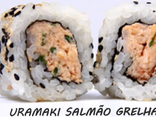04 Peças Uramaki Salmão Grelhado com Cream Cheese, Arroz Oriental , Toque Gergelim Acompanha 1 Sache Shoyu + 1 Hashi